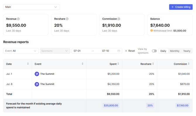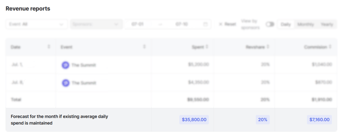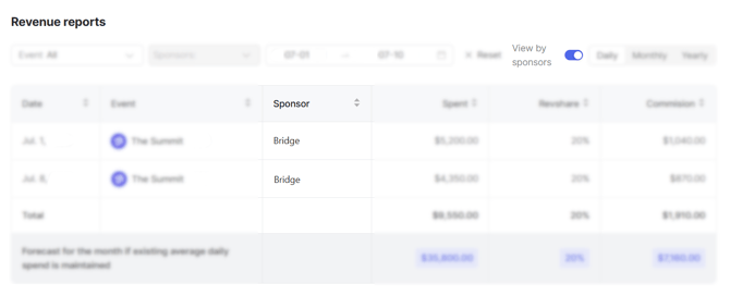 The Revenue reports tab gives organizers an overview of earnings, commission, and balance. It shows how much sponsors spent, the applied revenue share, and the commission earned, along with a forecast based on current trends.