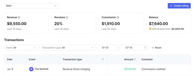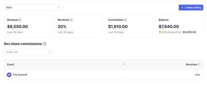 This section of Boost Express provides organizers with full visibility into their revenue, commissions, and withdrawals. The Billing menu includes several tabs that help track financial flows and manage payouts.