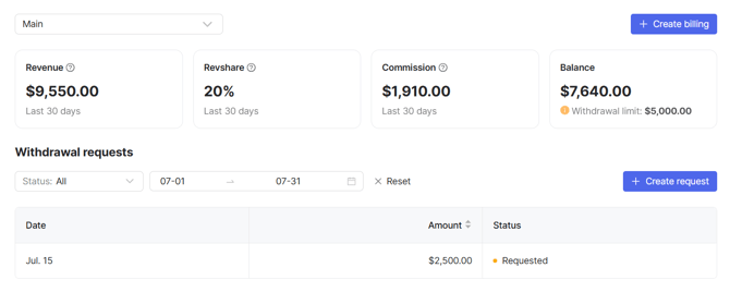 The Withdrawal requests tab lets you create and track payout requests for the selected billing account. Each account has its own list of requests. Payouts are sent to the information specified in Billing details.