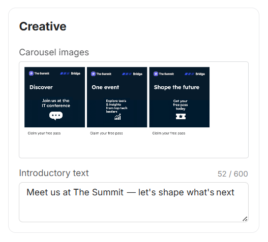 | Introductory text | A short message that introduces your creative — it appears above the carousel. |