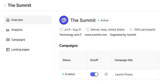 - Overview – key event info and a quick table of your campaigns for this event.