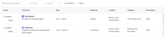 To explore new events and submit applications, open the Events catalog. It provides keyword search, date range controls, and advanced filters for location, category, expected participant count, and publication status.