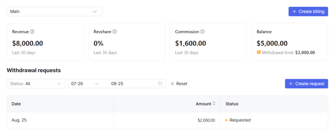 - Open Billing from the menu in the top-right corner, then go to Withdrawal requests.