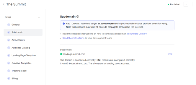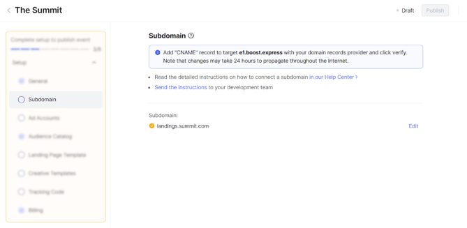 A subdomain allows you to create a separate, memorable address under your main domain name. In Boost Express, subdomains are used to host sponsors' landing pages on your own domain instead of a generic Boost Express link. For example, you could use landings.event.com to host all sponsor landing pages for your event, with each page dedicated to a specific sponsor.